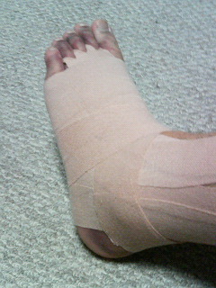 娘がバスケでやはりじん帯損傷の上に足首骨折して、もうそりゃーひどく腫れたのにギブスして一週間したら、新人戦のメンバーが足らなくてギブス外して、テーピングして試合に出たっけ。その足にそっくりだ!